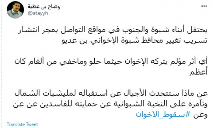 وقال في تغريدة عبر "تويتر" رصدها "المشهد العربي": "يحتفل أبناء شبوة والجنوب في مواقع التواصل بمجرد انتشار تسريب تغيير محافظ شبوة الإخواني بن عديو أي أثر مؤلم يتركه الإخوان حيثما حلو وما خفي من ألغام كان أعظم".