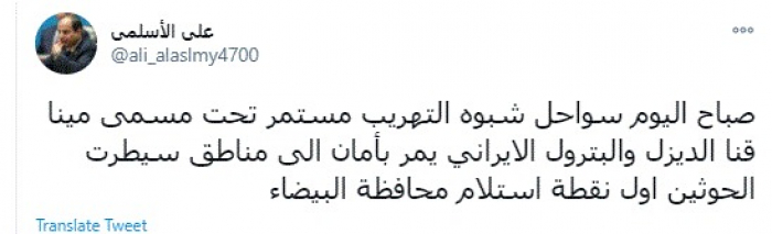 وكتب في تغريدة عبر "تويتر" رصدها "المشهد العربي": "صباح اليوم سواحل شبوة التهريب مستمر تحت مسمى ميناء قنا الديزل والبترول الإيراني يمر بأمان إلى مناطق سيطرة الحوثيين أول نقطة استلام محافظة البيضاء".