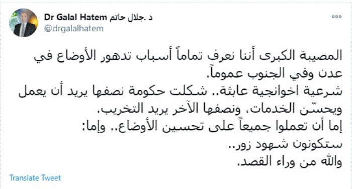 حاتم: الجميع يعلم أسباب تدهور الأوضاع في العاصمة عدن والجنوب