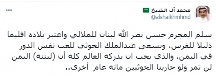 وأوضح في تغريدة على حسابه بموقع التدوين المصغر تويتر، اليوم أنه: "سلم المجرم حسن نصر الله لبنان للملالي واعتبر بلاده إقليما ذليلا للفرس، ويسعى عبدالملك الحوثي للعب نفس الدور في اليمن".