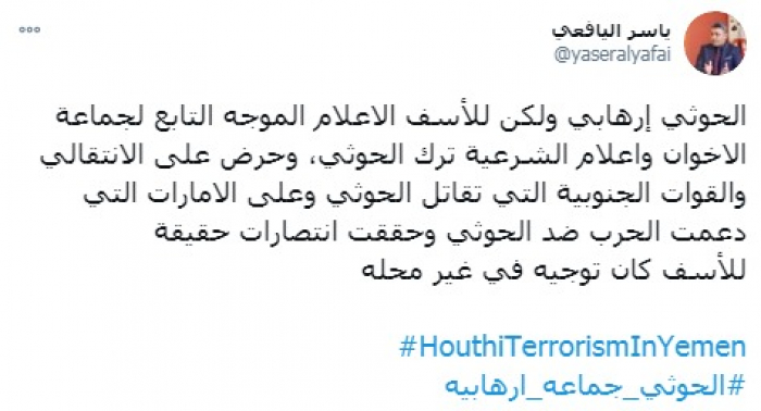 وقال في تغريدة على حسابه بموقع التدوين المصغر تويتر، اليوم إن: "الحوثي إرهابي ولكن للأسف الإعلام الموجه التابع لجماعة الإخوان وإعلام الشرعية ترك الحوثي، وحرض على الانتقالي والقوات الجنوبية التي تقاتل الحوثي".