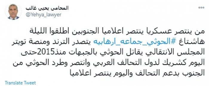 وقال في تغريدة عبر "تويتر" رصدها "المشهد العربي": "من ينتصر عسكريًا ينتصر إعلاميًا الجنوبيين أطلقوا الليلة هاشتاج الحوثي جماعة إرهابية يتصدر الترند ومنصة تويتر".