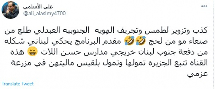 وقال في تغريدة عبر "تويتر" رصدها "المشهد العربي": "كذب وتزوير لطمس وتجريف الهوية الجنوبية العبدلي طلع من صنعاء مو من لحج".