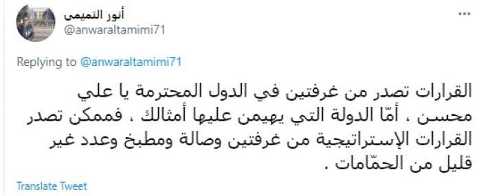 وأوضح: "القرارات تصدر من غرفتين في الدول المحترمة يا علي محسن، أمّا الدولة التي يهيمن عليها أمثالك، فممكن تصدر القرارات الاستراتيجية من غرفتين وصالة ومطبخ وعدد غير قليل من ...".