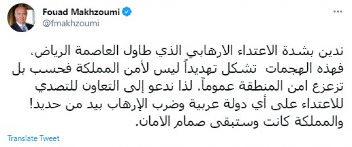 أدان السياسي اللبناني البارز فؤاد مخزومي، اليوم، محاولات مليشيات الحوثي الإرهابية للاعتداء على العاصمة السعودية الرياض، داعيًا للتصدي لأي اعتداءات إرهابية على الدول العربية، مؤكدًا أن المملكة كانت وستبقى صمام الأمان.