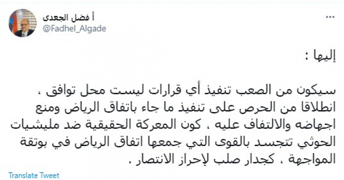 الجعدي: أي قرارات ليست محل توافق لن تنفذ لمنع الالتفاف على اتفاق الرياض