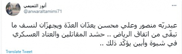 وكتب في تغريدة عبر "تويتر" رصدها "المشهد العربي": "عبدربه منصور وعلي محسن يعدّان العدّة ويُجهِّزان لنسف ما تبقّى من اتفاق الرياض.. حشد المقاتلين والعتاد العسكري في شبوة وأبين يؤكّد ذلك".