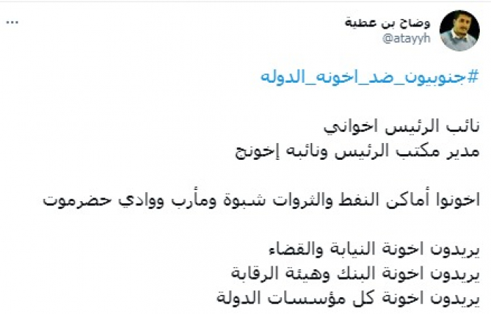 وأضاف: "أخونوا أماكن النفط والثروات، شبوة ومأرب ووادي حضرموت"، محذرا من أنهم: "يريدون أخونة النيابة والقضاء، يريدون أخونة البنك وهيئة الرقابة، يريدون أخونة كل مؤسسات الدولة".