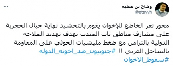 وأشار في تغريدة على حسابه بموقع التدوين المصغر تويتر، اليوم إلى أن: "محور تعز الخاضع للإخوان يقوم بالتحشيد نهاية جبال الحجرية على مشارف مناطق باب المندب بهدف تهديد الملاحة الدولية".