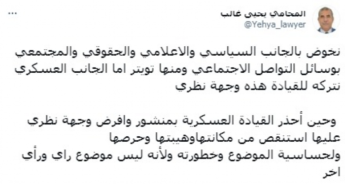 قال الناشط السياسي يحيى غالب إن الملف العسكري لا يخضع لوجهات نظر، مشيرا إلى حساسية تناول الشأن العسكري الجنوبي على وسائل التواصل الاجتماعي.