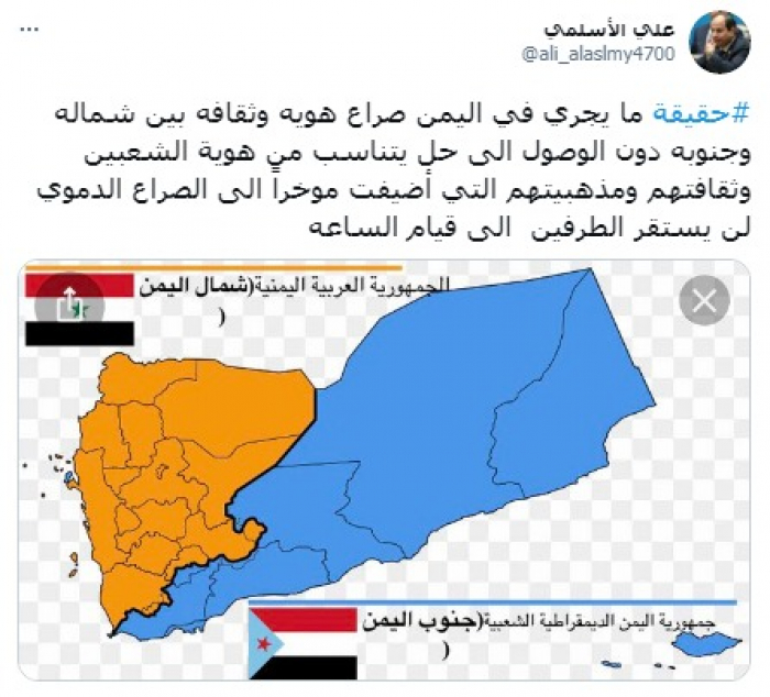 وأكد في تغريدة على حسابه بموقع التدوين المصغر تويتر، اليوم أنه: "حقيقة ما يجري في اليمن صراع هوية وثقافة بين شماله وجنوبه".