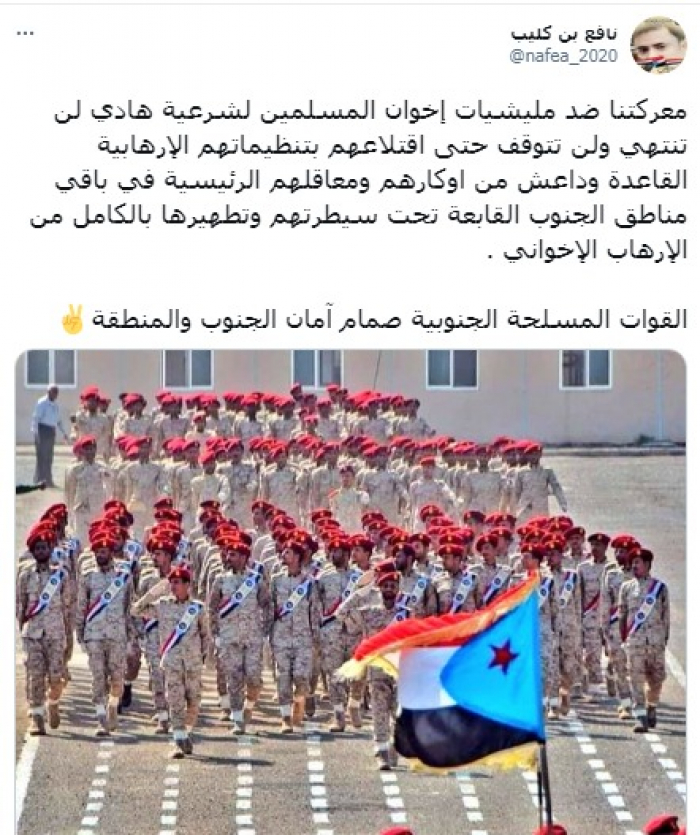 أكد الناشط السياسي نافع بن كليب، أن معركة تحرر الجنوب من مليشيات الشرعية الإخوانية، لن تتوقف حتى اقتلاع تنظيماتهم الإرهابية.