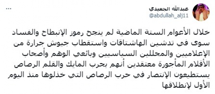ونبه في تغريدة على حسابه بموقع التدوين المصغر تويتر، اليوم إلى أنه: "خلال الأعوام الستة الماضية لم تنجح رموز الانبطاح والفساد سوى في تدشين الهاشتاقات واستقطاب جيوش جرارة من الإعلاميين والمحللين السياسيين وبائعي الوهم وأصحاب الأقلام المأجورة".