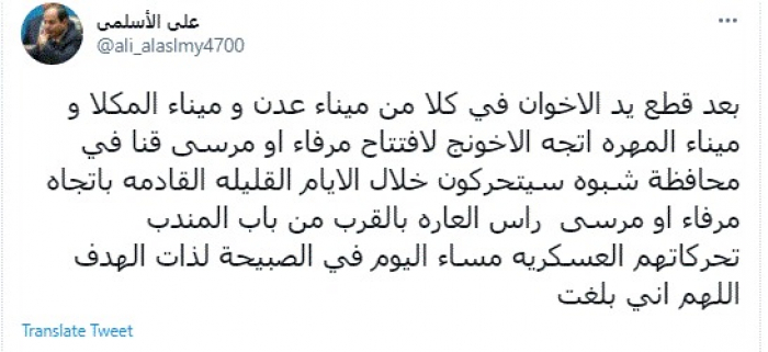 حذر الناشط السياسي علي الأسلمي، اليوم، من تحركات الشرعية الإخوانية بالقرب من باب المندب.