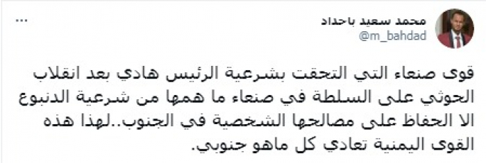 باحداد: قوى يمنية تتستر بهادي لحماية مصالحها في الجنوب