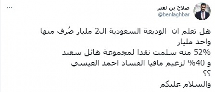 وأضاف في تغريدة على حسابه بموقع التدوين المصغر تويتر، اليوم: "هل تعلم أن الوديعة السعودية الـ 2 مليار صُرف منها واحد مليار 52% منه سلمت نقدا لمجموعة هائل سعيد و40% لزعيم مافيا الفساد أحمد العيسي؟؟ والسلام عليكم".