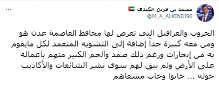 وقال في تغريدة على حسابه بموقع التدوين المصغر تويتر، اليوم إن: "الحروب والعراقيل التي تعرض لها محافظ العاصمة عدن هو ومن معه كبيرة جدا، إضافة إلى التشويه المتعمد لكل ما يقوم به من إنجازات".