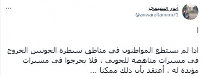 وشدد في تغريدة على حسابه بموقع التدوين المصغر تويتر، اليوم على أنه: "إذا لم يستطع المواطنون في مناطق سيطرة الحوثيين الخروج في مسيرات مناهضة للحوثي، فلا يخرجوا في مسيرات مؤيدة له، أعتقد بأن ذلك ممكنًا".