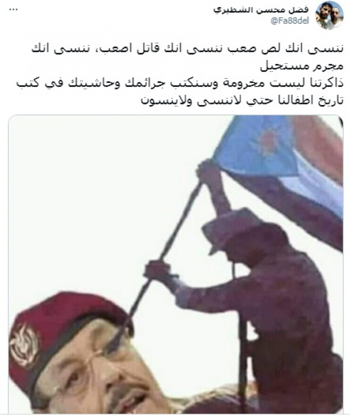 أكد فضل الشطيري رئيس دائرة الشباب والطلاب بالمجلس الانتقالي الجنوبي في يافع، أنه يستحيل نسيان جرائم الجنرال الإرهابي علي محسن الأحمر في الجنوب.