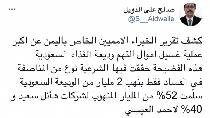 وكتب "الدويل" تغريدة عبر حسابه بتويتر، رصدها "المشهد العربي": "كشف تقرير الخبراء الأمميين الخاص باليمن عن أكبر عملية غسيل أموال التهمت وديعة الغذاء السعودية".