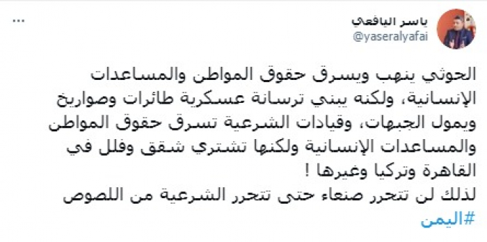 وأضاف: "وقيادات الشرعية تسرق حقوق المواطن والمساعدات الإنسانية ولكنها تشتري شققا وفللا في القاهرة وتركيا وغيرها!".