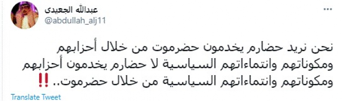 وكتب في تغريدة عبر "تويتر" رصدها "المشهد العربي": "نحن نريد حضارم يخدمون حضرموت من خلال أحزابهم ومكوناتهم وانتماءاتهم السياسية لا حضارم يخدمون أحزابهم ومكوناتهم وانتماءاتهم السياسية من خلال حضرموت".