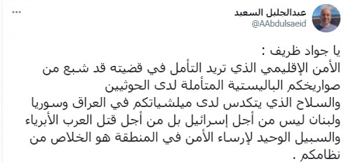 وجه الإعلامي السوري عبدالجليل السعيد، اليوم، رسالة نارية لوزير الخارجية الإيراني محمد جواد ظريف، وذلك بعد دعوته المسمومة للحوار مع الدول العربية.