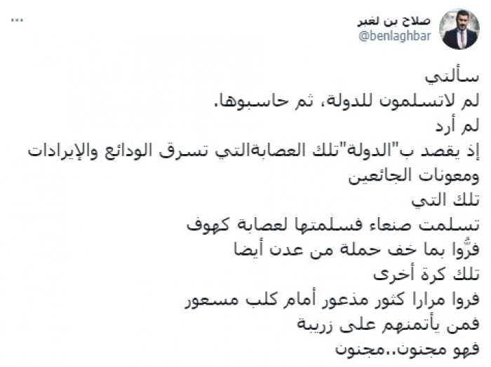وصف الكاتب الصحفي صلاح بن لغبر الشرعية الإخوانية بالعصابة التي تسرق الودائع ومعونات الجائعين.