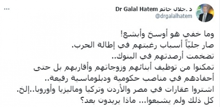 وقال في تغريدة على حسابه بموقع التدوين المصغر تويتر، اليوم إنه: "وما خفي هو .... وأبشع!، صار جليّا أسباب رغبتهم في إطالة الحرب، تضخمت أرصدتهم في البنوك".