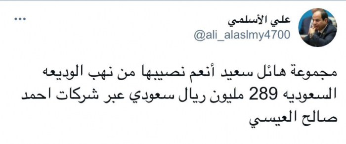 وأكد في تغريدة على حسابه بموقع التدوين المصغر تويتر، اليوم أن: "مجموعة هائل سعيد أنعم نصيبها من نهب الوديعة السعودية 289 مليون ريال سعودي عبر شركات أحمد صالح العيسي"، في إشارة لتورط أبرز القيادات الفاسدة في جريمة السطو على الوديعة.