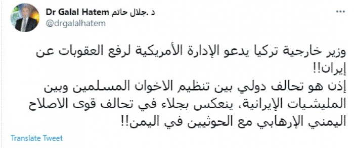 وقال في تغريدة عبر "تويتر" رصدها "المشهد العربي": "وزير خارجية تركيا يدعو الإدارة الأمريكية لرفع العقوبات عن إيران! إذن هو تحالف دولي بين تنظيم الإخوان المسلمين وبين المليشيات الإيرانية، ينعكس بجلاء في تحالف قوى الإصلاح اليمني الإرهابي مع الحوثيين في اليمن".