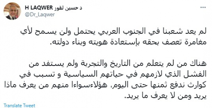 وقال في تغريدة عبر "تويتر" رصدها "المشهد العربي": "لم يعد شعبنا في الجنوب العربي يحتمل ولن يسمح لأي مغامرة تعصف بحقه باستعادة هويته وبناء دولته".