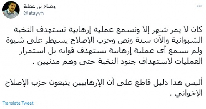 ألمح الكاتب الصحفي وضاح بن عطية، اليوم، إلى تبعية العناصر الإرهابية المتورطة في استهداف قوات النخبة الشبوانية لحزب الإصلاح اليمني.