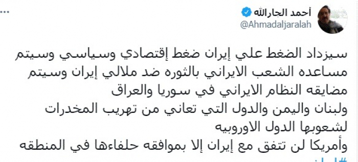 توقع عميد الصحافة الكويتية ورئيس تحرير صحيفة السياسة الكويتية أحمد الجارالله، اليوم، زيادة الضغط السياسي والاقتصادي على إيران، مؤكدًا أنه سيتم مضايقة الوجود الإيراني في سوريا والعراق ولبنان واليمن.