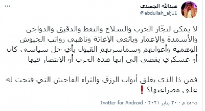 وكتب "الجعيدي" تغريدة عبر حسابه بتويتر، رصدها "المشهد العربي": "لا يمكن لتجّار الحرب والسلاح والنفط والدقيق والدواجن والأسمدة والإعمار وبائعي الإغاثة وناهبي رواتب الجيوش الوهمية وأعوانهم وسماسرتهم القبول بأي حل سياسي كان أو عسكري يفضي إلى إنها هذه الحرب أو الانتصار فيها".