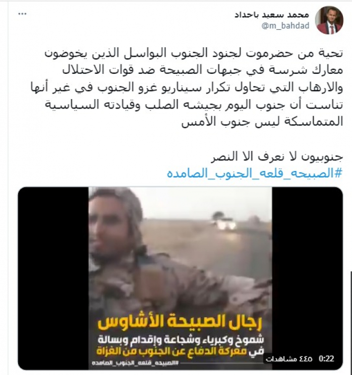 وقال "باحداد" عبر تغريدة له بتويتر، رصدها "المشهد العربي": "تحية من حضرموت لجنود الجنوب البواسل الذين يخوضون معارك شرسة في جبهات الصبيحة ضد قوات الاحتلال والإرهاب التي تحاول تكرار سيناريو غزو الجنوب، غير أنها تناست أن جنوب اليوم بجيشه الصلب وقيادته السياسية المتماسكة ليس جنوب الأمس".