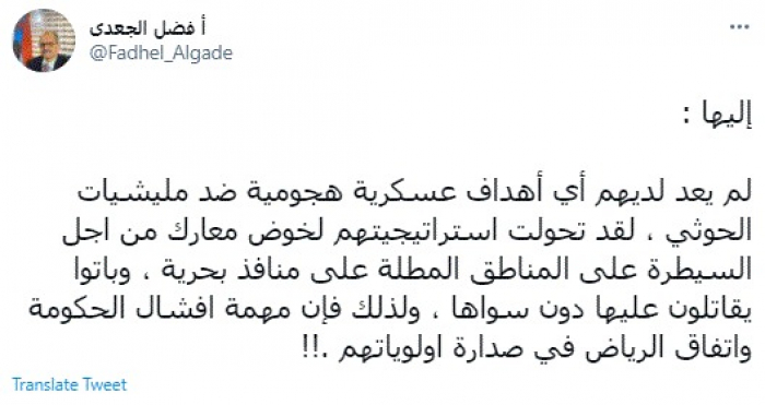 وكتب في تغريدة عبر "تويتر" رصدها "المشهد العربي": "لم يعد لديهم أي أهداف عسكرية هجومية ضد مليشيات الحوثي، لقد تحولت استراتيجيتهم لخوض معارك من أجل السيطرة على المناطق المطلة على منافذ بحرية وباتوا يقاتلون عليها دون سواها".
