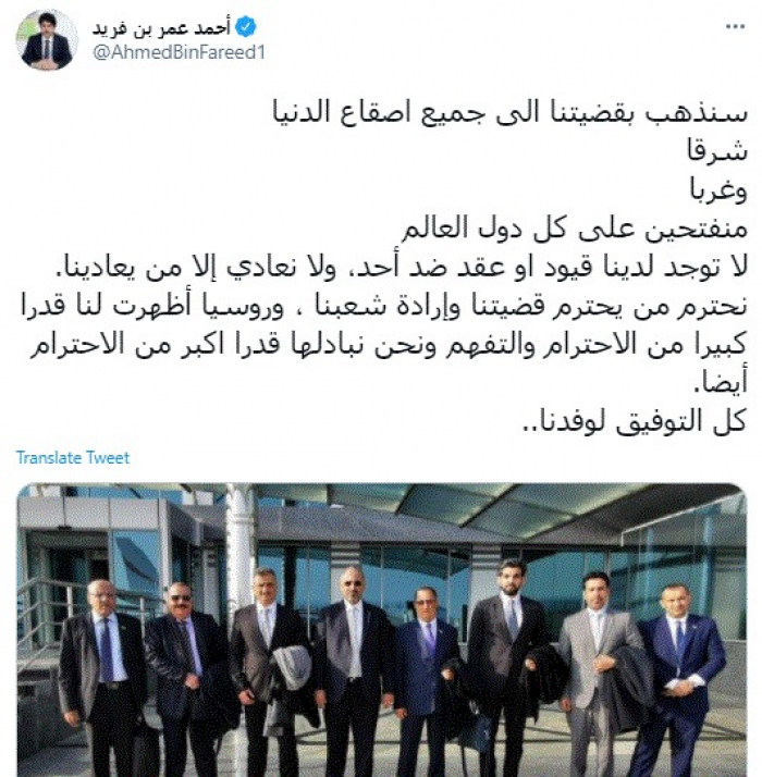 قال رئيس دائرة العلاقات الخارجية بالمجلس الانتقالي الجنوبي في أوروبا أحمد عمر بن فريد، اليوم، إن روسيا أظهرت قدرًا كبيرًا من الاحترام للمجلس الانتقالي الجنوبي، مؤكدًا أن المجلس سيذهب بالقضية الجنوبية إلى جميع أصقاع الدنيا.