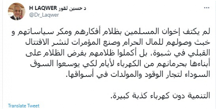 وأضاف: "بل أكملوا ظلامهم بفرض الظلام على أبناءها بحرمانهم من الكهرباء لأيام لكي يوسعوا السوق السوداء لتجار الوقود والمولدات في أسواقها".