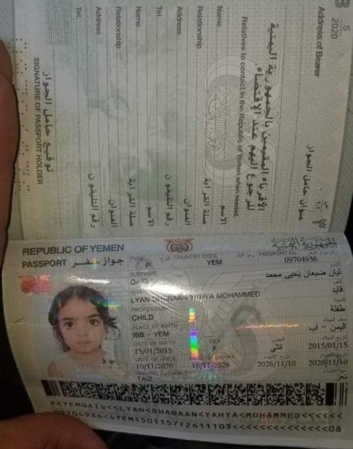 ولفتت إلى أن الشخصين نجحا بتواطؤ من موظفي الأحوال المدنية في مديرية يريم، في استخراج شهادة ميلاد باسمها الجديد ليان ضبعان يحيى محمد، قبل أن يستخرجوا لها جواز سفر في محاولة لتهريبها إلى الخارج.