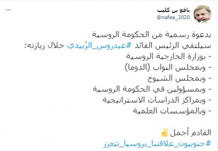 وأوضح في تغريدة على حسابه بموقع التدوين المصغر تويتر، اليوم أنه: "سيلتقي الرئيس القائد عيدروس الزُبيدي خلال زيارته، بوزارة الخارجية الروسية، وبمجلس النواب (الدوما)، وبمجلس الشيوخ، وبمسؤولين في الحكومة الروسية، وبمراكز الدراسات الاستراتيجية، وبالمؤسسات العلمية"، متابعا: "القادم أجمل".