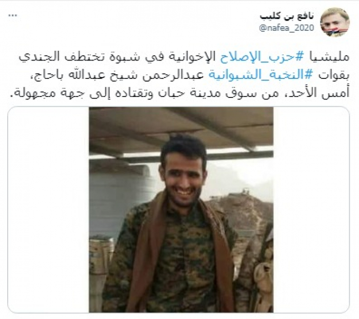 وأكد في تغريدة على حسابه بموقع التدوين المصغر تويتر اليوم أن: "مليشيا حزب الإصلاح الإخوانية في شبوة اختطفت الجندي بقوات النخبة الشبوانية عبدالرحمن شيخ عبدالله باحاج، أمس الأحد".