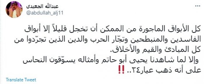وقال في تغريدة عبر "تويتر" رصدها "المشهد العربي": "كل الأبواق الماجورة من الممكن أن تخجل قليلًا إلا أبواق الفاسدين والمنبطحين وتجّار الحرب والدين الذين تجرّدوا من كل المبادئ والقيم والأخلاق".