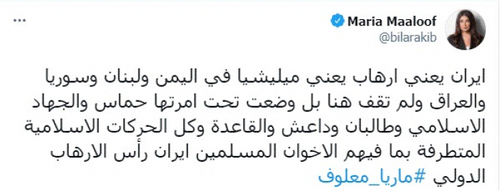 شنت الإعلامية اللبنانية ماريا معلوف، اليوم، هجومًا حادًا على إيران ومليشياتها في المنطقة العربية، واصفةً إياها برأس الإرهاب الدولي.