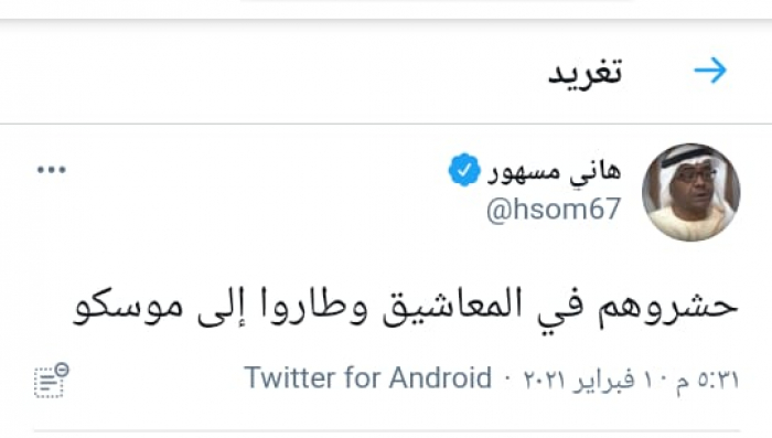 وقال في تغريدة على حسابه بموقع التدوين المصغر تويتر اليوم إنهم: "حشروهم في المعاشيق وطاروا إلى موسكو"، في إشارة لمغادرة وفد المجلس إلى روسيا.