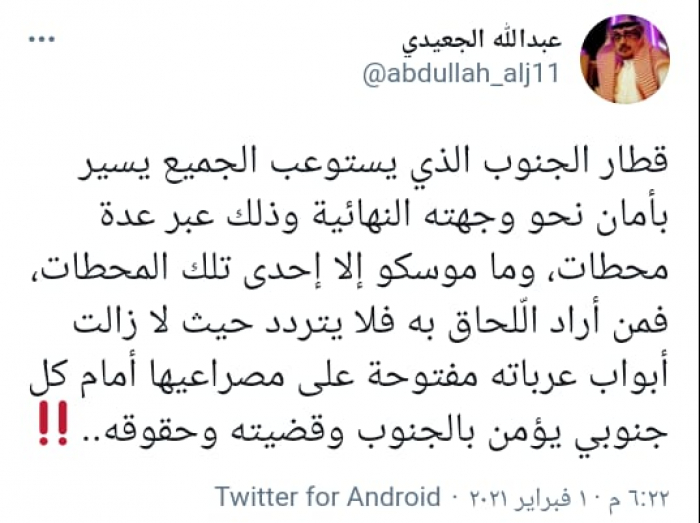 وأضاف أن "من أراد اللحاق به فلا يتردد، حيث لا زالت أبواب عرباته مفتوحة على مصراعيها أمام كل جنوبي يؤمن بالجنوب وقضيته وحقوقه".