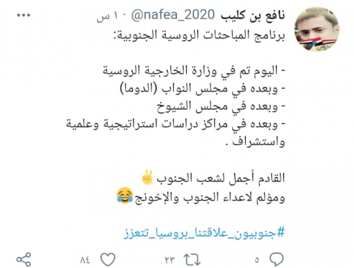 واختتم تغريدته بهاشتاج: "جنوبيون علاقتنا بروسيا تتعزز".