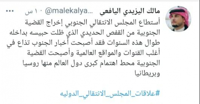 وأكد في تغريدة على حسابه بموقع التدوين المصغر تويتر اليوم أنه: "استطاع المجلس الانتقالي الجنوبي إخراج القضية الجنوبية من