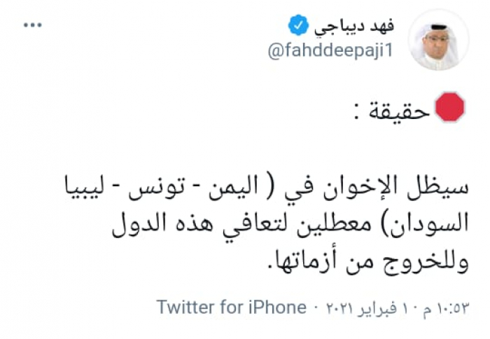 وأكد في تغريدة على حسابه بموقع التدوين المصغر تويتر اليوم أنه: "حقيقة: سيظل الإخوان في (اليمن - تونس - ليبيا - السودان) معطلين لتعافي هذه الدول وللخروج من أزماتها".