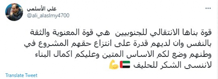 وكتب في تغريدة عبر "تويتر" رصدها "المشهد العربي": "قوة بناها الانتقالي للجنوبيين هي القوة المعنوية والثقة بالنفس وأن لديهم قدرة على انتزاع حقهم المشروع في وطنهم وضع لكم الأساس المتين وعليكم إكمال البناء لا ننسى الشكر للحليف (دولة الإمارات العربية المتحدة)".